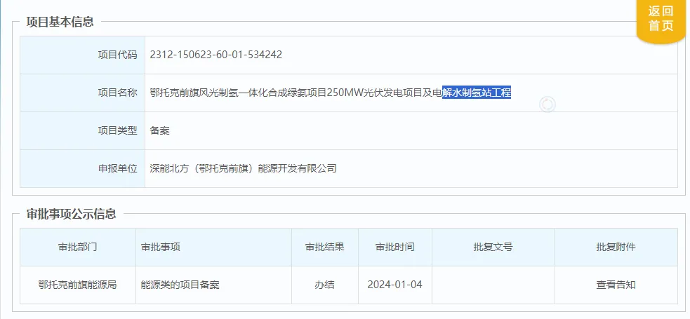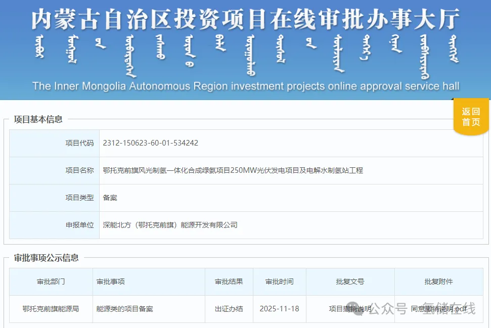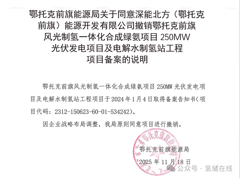 11月18日,内蒙古自治区投资项目在线审批办事大厅发布《鄂托克前旗能源局关于同意深能北方(鄂托克前旗)能源开发有限公司撤销鄂托克前旗风光制氢一体化合成绿氨项目250MW光伏发电项目及电解水制氢站工程项目备案的说明》。公告指出,撤销原因为企业战略布局调整。