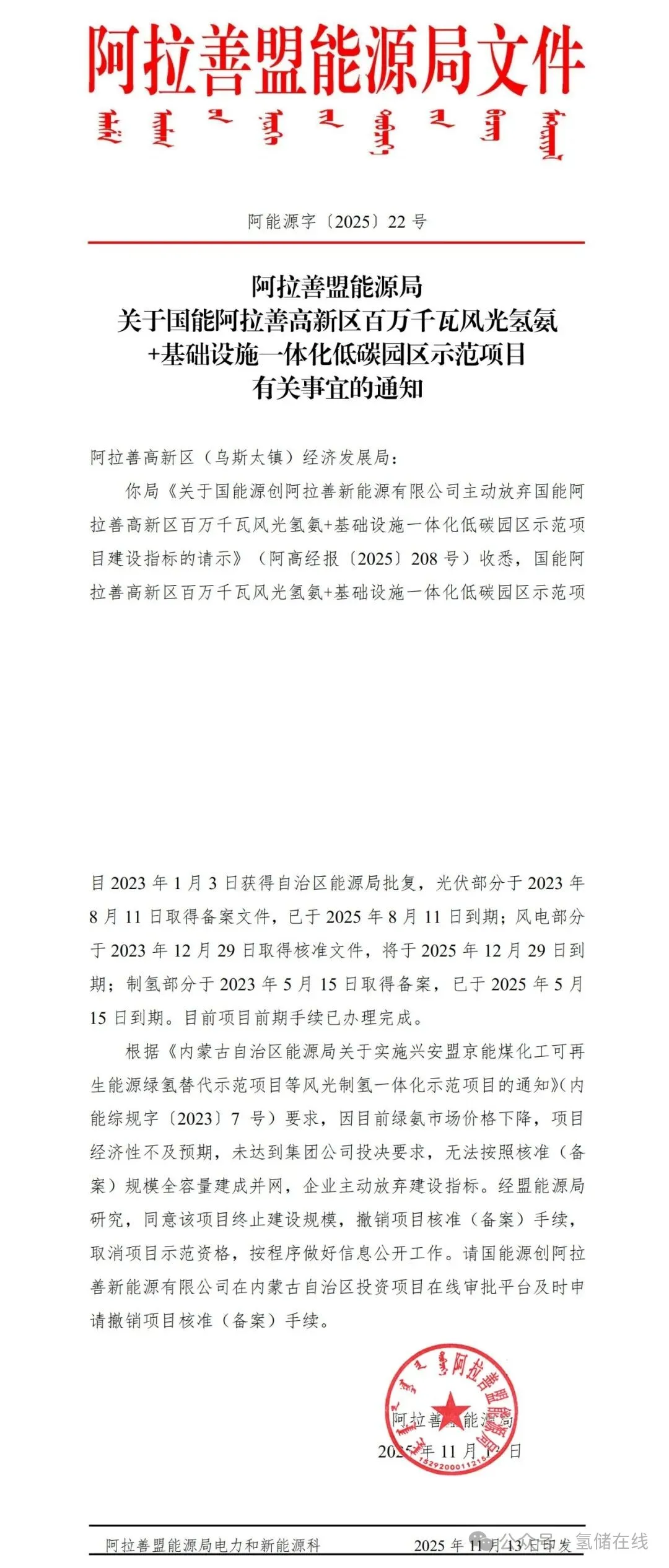 因目前绿氨市场价格下降,项目经济性不及预期,未达到集团公司投决要求,无法按照核准(备案)规模全容量建成并网,企业主动放弃建设指标。经盟能源局研究,同意该项目终止建设规模,撤销项目核准(备案)手续,取消项目示范资格。